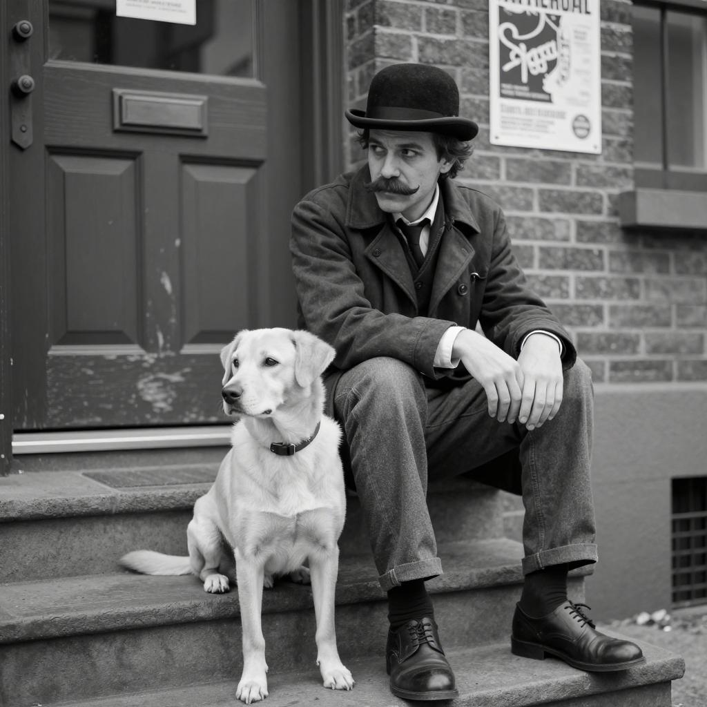 A man with a thick mustache, wearing a dark bowler hat, dark jacket, and gray pants, sitting on the steps of a brick building. He has one arm resting on his knee and the other on his lap. A light-colored dog sits beside him. The background includes a worn wooden door and brick walls with posters. The man looks intently to the side, while the dog looks forward. Two wooden steps are on the left.
