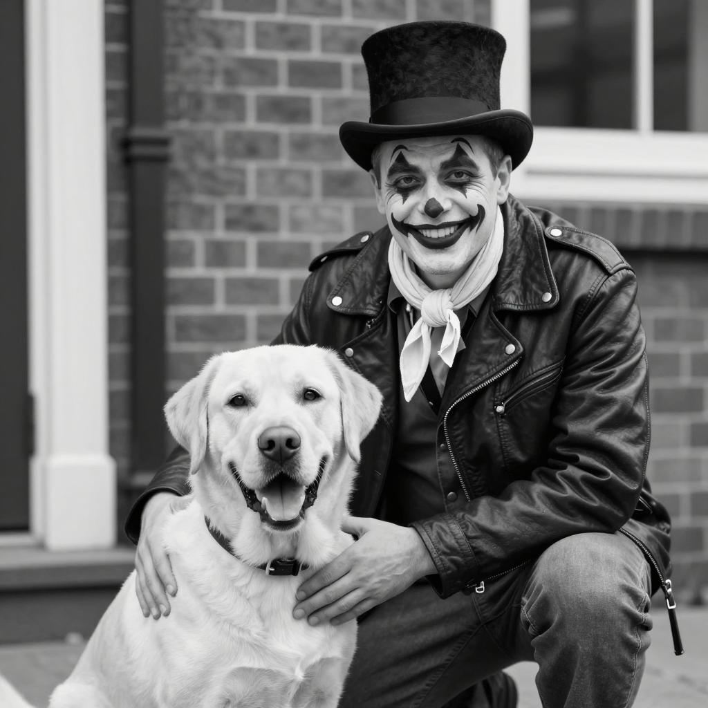 A man with a thick mustache, wearing a dark bowler hat, dark jacket, vest, gray pants, and black leather shoes, sits on concrete steps in front of a worn wooden door and red brick wall. He is seated beside a light-colored Labrador retriever dog with a blue collar. The man has one arm resting on his knee and the other on the dog's head, looking intently to the side while the dog looks forward. The background includes posters on the brick wall.