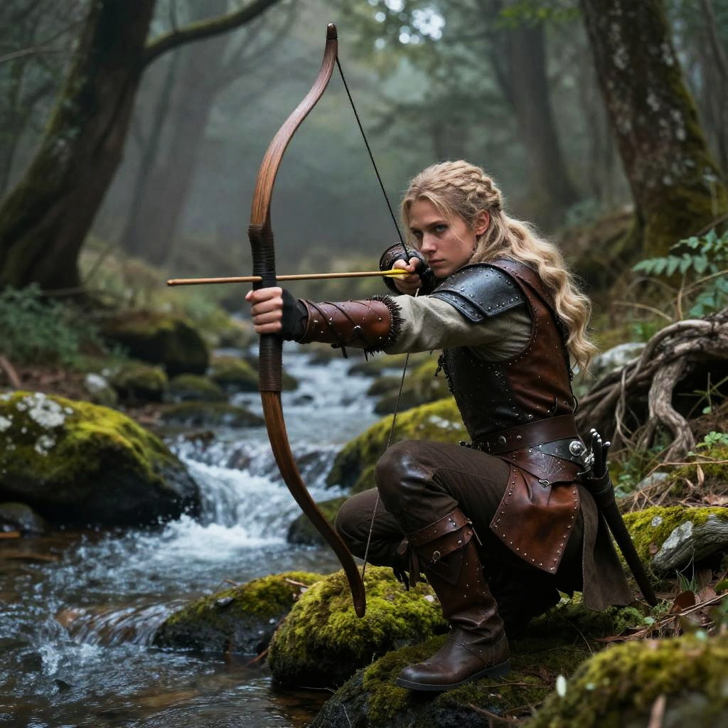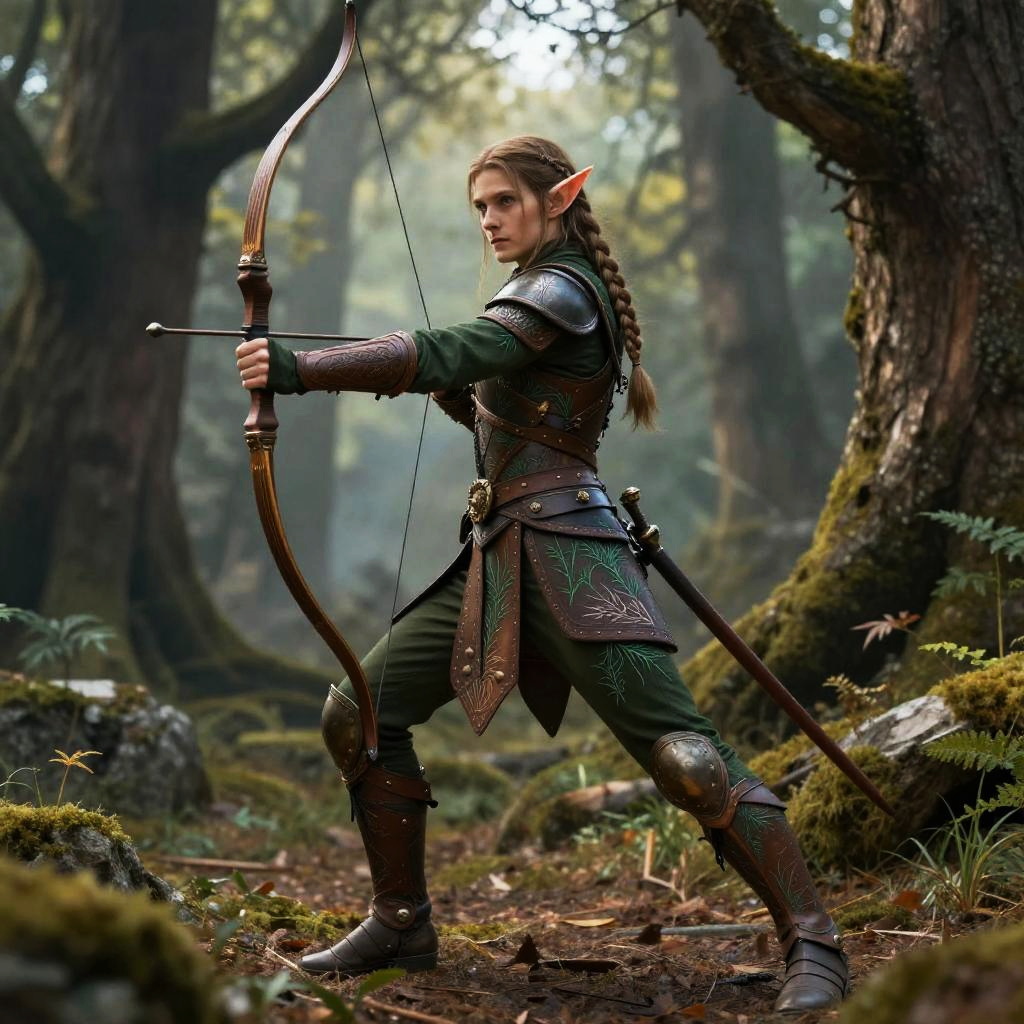 A elven archer poised braving the tumultuous ocean waves, illuminated by the golden sunset, with a floating brass galleon hovering above, casting ethereal light, as time intertwines in this mystical encounter.