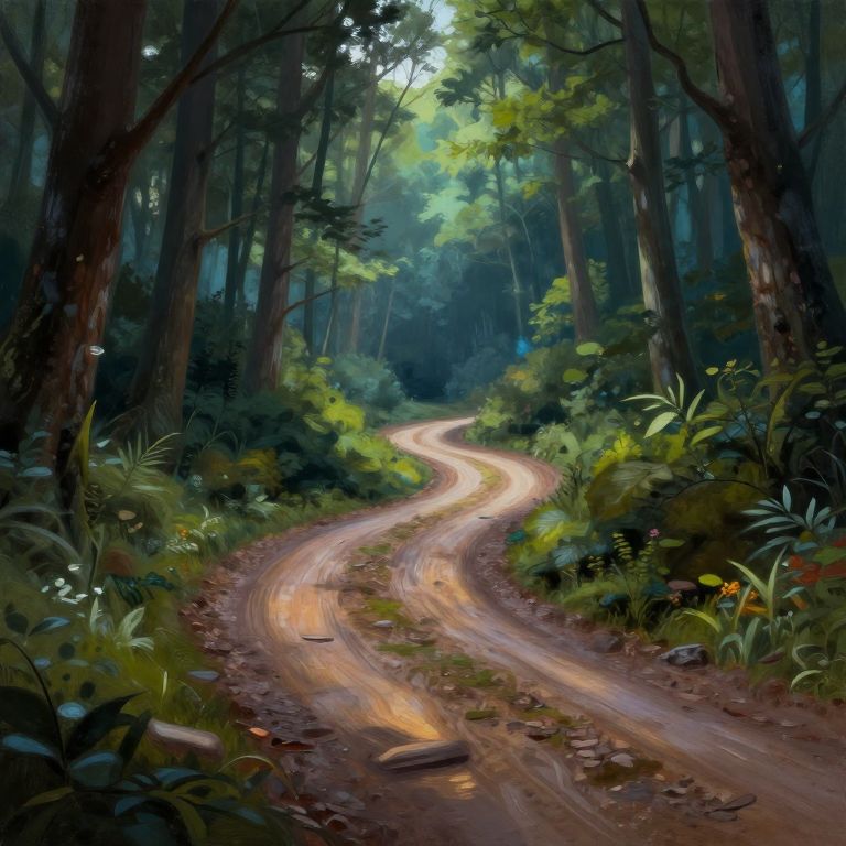 Digital painting of a winding dirt path through a dense, lush forest with tall trees, vibrant green foliage, and dappled sunlight.