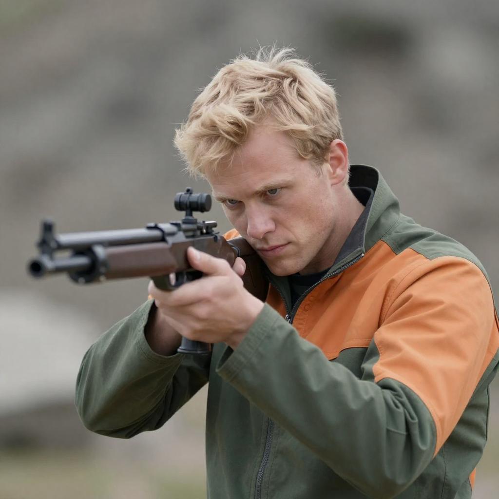 Blonde man with fair skin, intense expression, aiming black rifle forward, wearing green and orange jacket, rocky outdoor background. Upper body shot, focused on rifle, slight blur in background. One person.