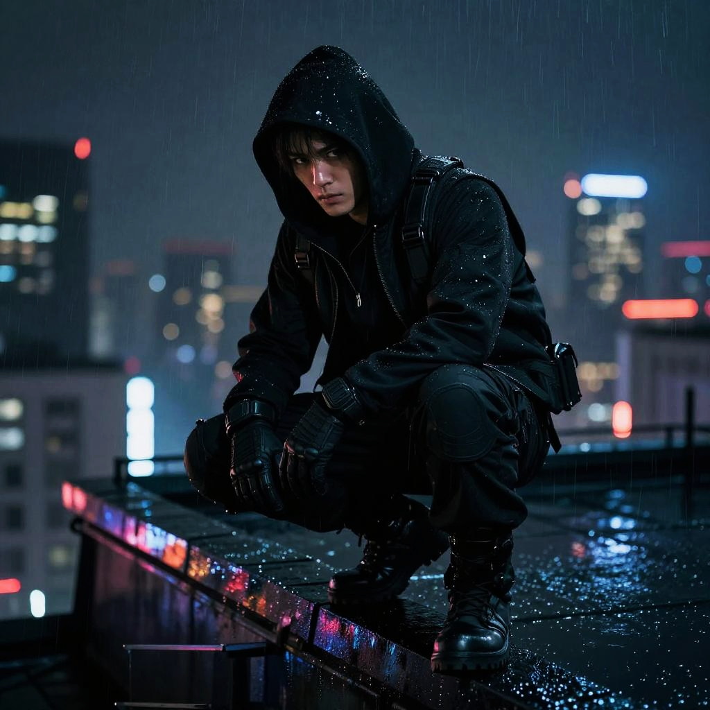 Cyberpunk cityscape at night, neon lights, graffiti-covered buildings. Hooded, black-jacketed man with gloves and cross necklace stands confidently