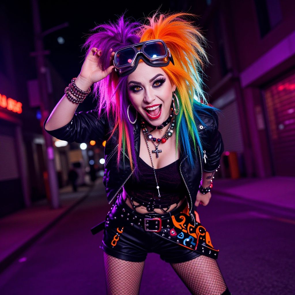 Photograph of a punk-style woman standing in a dimly lit food truck. She has spiky black hair, heavy makeup, and wears a white Nirvana T-shirt with a colorful Smiley face graphic, fishnet stockings, and large red earrings. Her outfit is accessorized with multiple necklaces. The background shows neon lights, a poster on the left, and a table with condiments on the right. The overall vibe is edgy and rebellious, with a mix of grunge and punk influences. The colors are vivid, with the neon lights adding a pop of color to the otherwise dark interior.