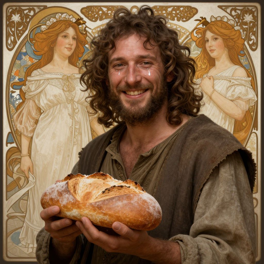 Photorealistic digital art of a surprised, curly-haired man in vintage attire, holding a pizza with floating slices, set against an Art Nouveau-style