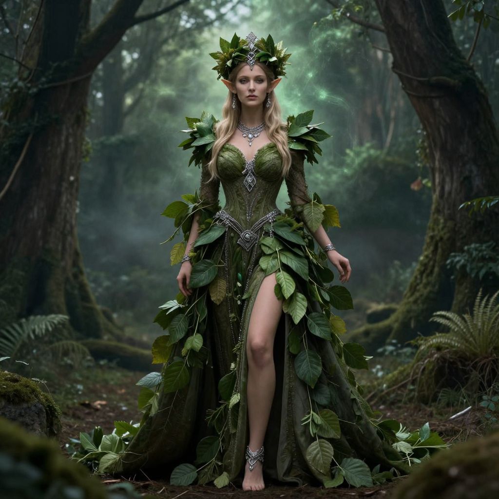 Photograph of a blonde, fair-skinned woman in a green leafy forest dress, adorned with a leaf crown, standing confidently with a leg visible