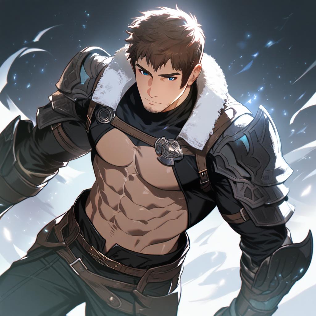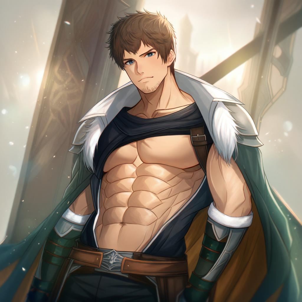 Ardbert hylfyst, final fantasy, 1boy, mature male, blue eyes, short hair, brown hair, hyur, bara, muscular male, stubble, large pectorals, abs, by artist ruu (tksymkw), illustrious