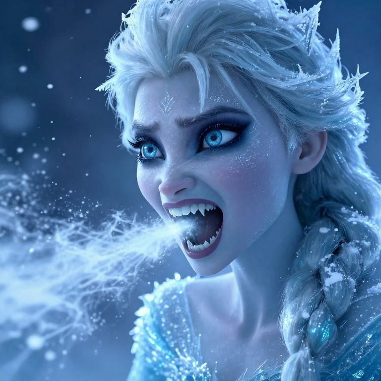 A cinematic pop Art extreme close-up of Elsa reimagined as a terrifying ice witch with Frost breath, Her mouth is wide open in a menacing scream, revealing sharp, jagged teeth, as icy breath escapes into the frosty air, Her translucent, ocean-blue skin glows faintly, as if made of ice, with intricate frost patterns glistening across her face, Her wide, glowing eyes exude both beauty and terror, contrasting with the eerie perfection of her icy form, Backlighting creates a dramatic, atmospheric glow, illuminating the snowflakes swirling in the air and emphasizing the sharp edges of her frozen visage, The scene is chilling, intense, and hauntingly beautiful