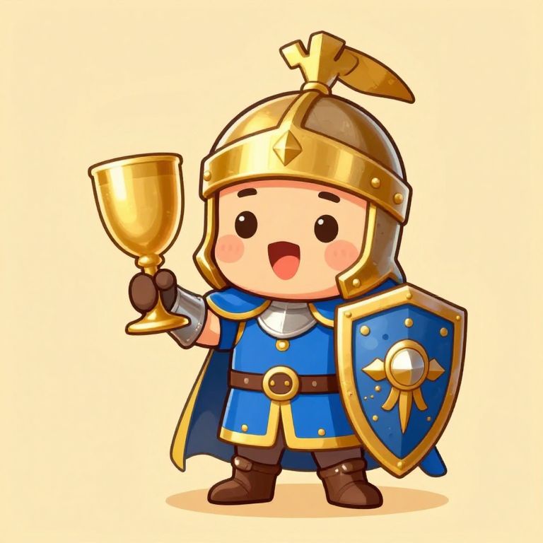 The image features a charming chibi knight of Camelot, depicted in a humorous and endearing manner. The knight, with a round, expressive face and rosy cheeks, is adorned in a golden helmet with a crest and a matching shield. He holds a large, golden chalice in one hand and a smaller trophy in the other, both exuding a sense of triumph and victory. The knight's outfit is a blend of blue and gold, with a belt and a cape that add to his regal appearance. The overall color palette is dominated by shades of gold and blue, creating a warm and inviting atmosphere. The knight's facial expressions, ranging from surprise to joy, add a playful and lighthearted touch to the scene. The composition is well-balanced, with the knight centrally positioned and the objects he holds clearly visible, creating a sense of depth and dimension. The image is a delightful blend of humor and fantasy, capturing the essence of a victorious knight in a whimsical and engaging manner.