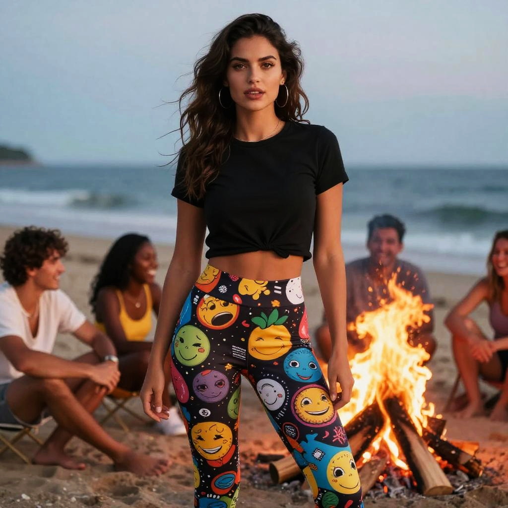 Photograph of a young woman with long, wavy dark hair and olive skin standing on a beach at sunset. She wears a black, short-sleeve crop top and vibrant, black leggings adorned with colorful, smiling emoji faces. In the background, a small group of people sits around a glowing campfire on the sandy beach, with the ocean and horizon visible under a clear sky. The woman's confident stance and direct gaze are prominent. The campfire's bright flames contrast with the soft, natural light of the setting sun.
