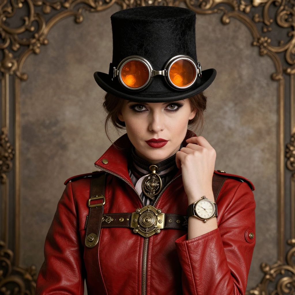 Steampunk portrait of a pale-skinned woman with red hair, dark makeup, and black lace choker, wearing a clock-adorned hat