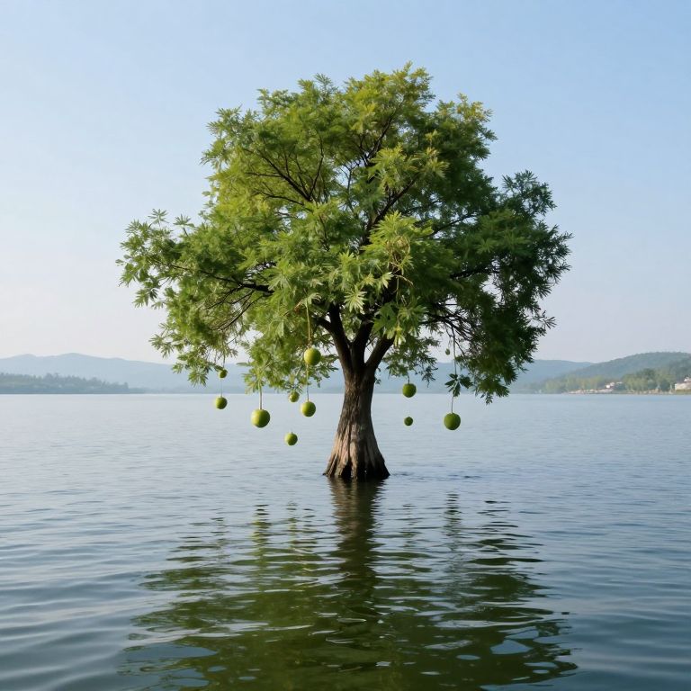 Photograph of a solitary tree with lush green leaves standing in a calm, expansive lake. The tree's thick trunk is partially submerged, and several green fruit hang from its branches. The water reflects the clear blue sky, creating a serene atmosphere. In the background, distant rolling hills are faintly visible under a light haze. The tree is centrally positioned, with gentle ripples around its base, adding a sense of tranquility to the scene. The image has a bright, natural light, enhancing the vivid colors and peaceful ambiance.