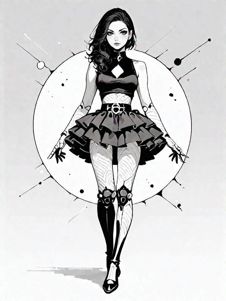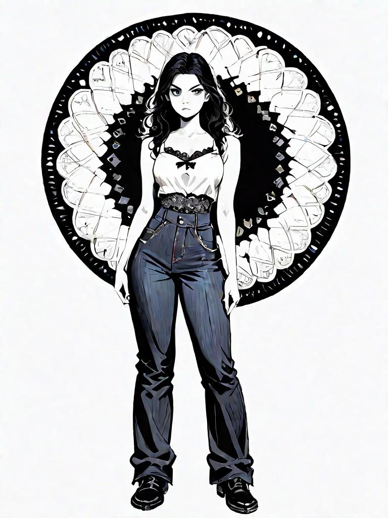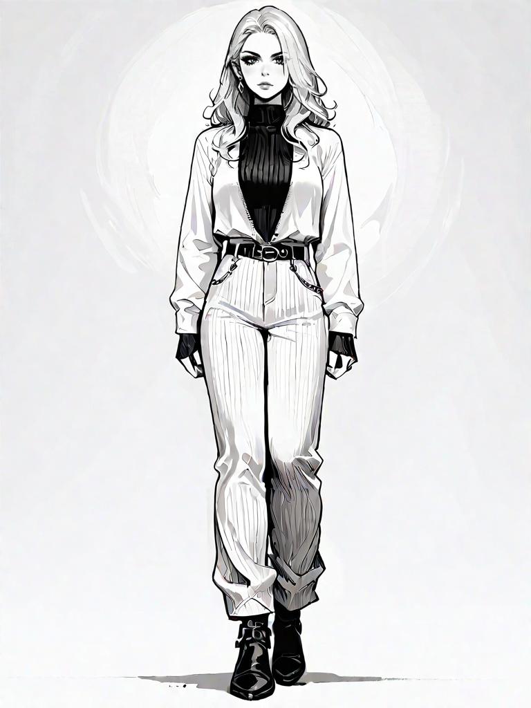 1girl, source_comics, realistic face, full body shot, Woman, chic, sleeveless monochrome top with black and white baroque patterns, lace trimming at the hem, paired with black skinny pants, accessorized with a small black and white clutch with a circular design.