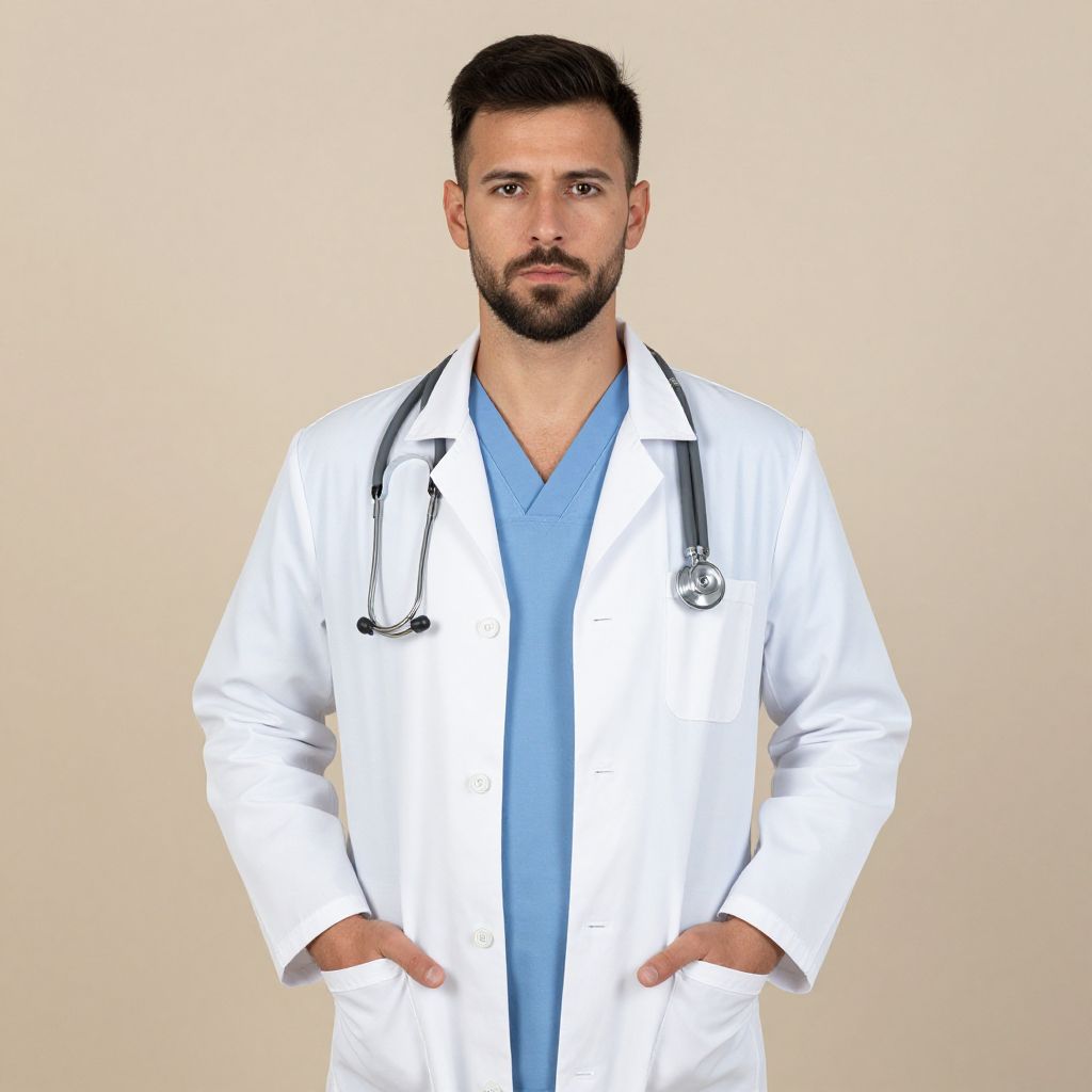 Photograph of a young, Caucasian male doctor with a medium build and neatly groomed dark brown hair and beard. He has a serious expression and is wearing a white lab coat over a light blue medical scrub top. A black stethoscope hangs around his neck. His hands are placed in the pockets of his lab coat. The background is a plain, beige color, providing a simple and uncluttered setting that focuses attention on the subject. The lighting is even, highlighting his features and the crispness of his attire.