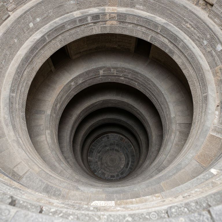 Circular stone architecture spirals inward, forming concentric rings that evoke an endless descent into a geometric abyss, blending ancient craftsmanship with surreal depth.