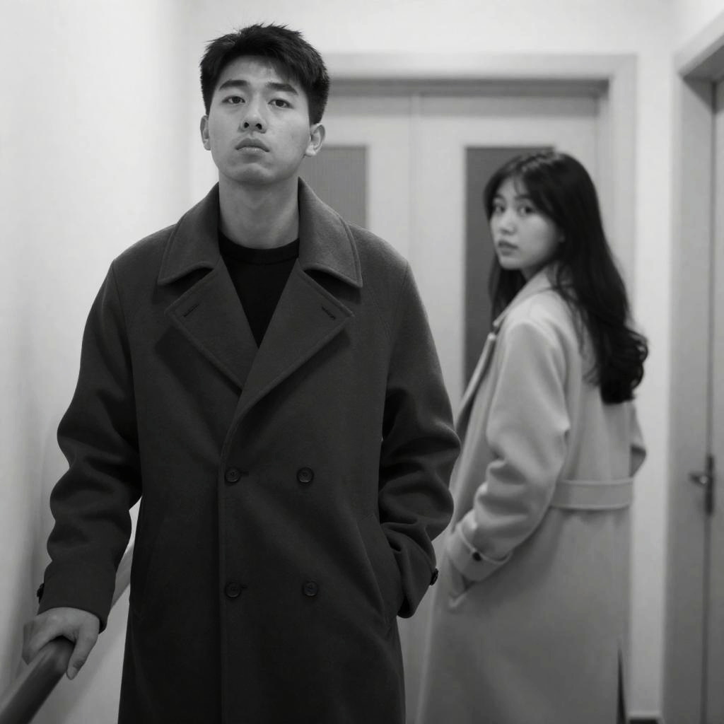 Black-and-white photograph of three people. A man with short dark hair, wearing a coat and scarf, stands behind a woman with curled hair and a light coat. She faces a second man with slicked-back hair, wearing a dark turtleneck and coat. He looks down at her, while the first man holds her shoulder. Neutral background. Intense facial expressions on all three.
