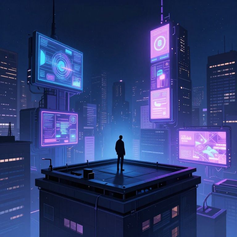 Drakealbum theme illustration, a futuristic city at night with a lone figure standing on a rooftop, surrounded by glowing billboards and holograms, cool blue and purple tones, cinematic atmosphere