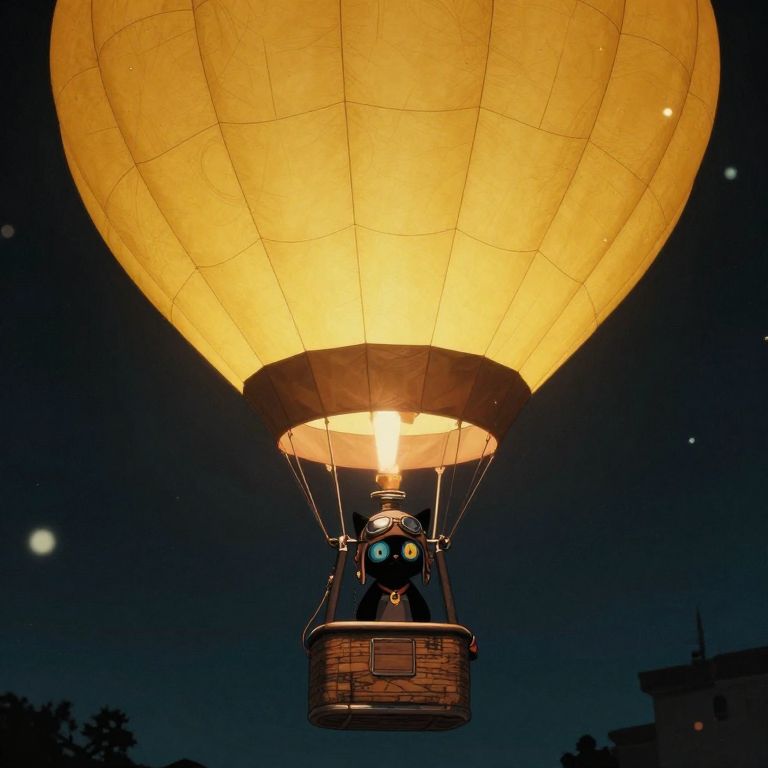 Cinematic film still award winning photo, A hotairballoon made from the brightest of yellow, In its basic is a black cat with an aviator helmet and goggles, deep depth of field, vignette, bokeh, moody, epic, film grain, grainy, anime, cyberpunk, Comic book style