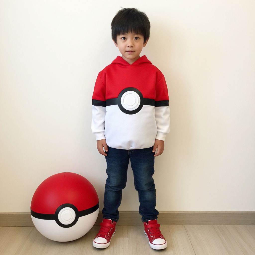 "kid pokeball costume, 1boy, poke ball, shoes, hood, sneakers, male focus, pants, cosplay, poke ball (basic), black hair, pokemon (creature), red footwear, denim, jeans, indoors, looking at viewer, standing, solo, parody, full body Realistic photo of casual sexy person with pretty face"