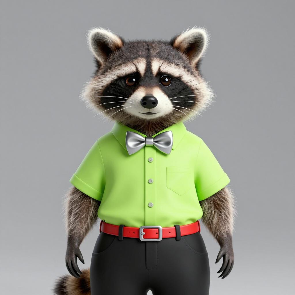 Anthropomorphic raccoon standing upright wearing a neon green short-sleeve shirt with buttons, a silver bow tie, black high-waist pants, and a red belt. The raccoon has a detailed face with expressive eyes and black and white fur, set against a plain gray background.