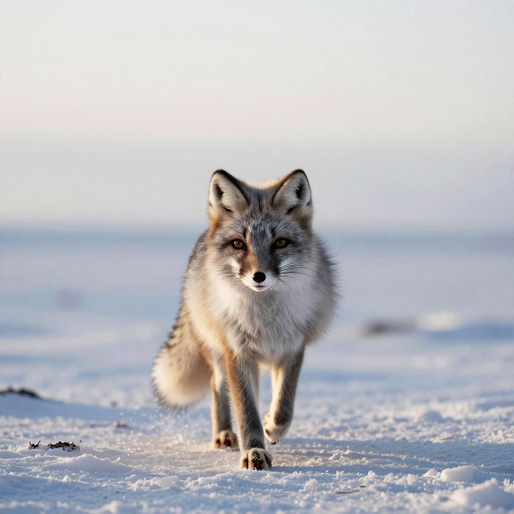 Curious arctic fox trotting through snow on frozen tundra under soft overcast sky, in soft muted tone environmental photo; heroic stance, warm rim light, detailed textures and fine fur/skin, expressive eyes, atmospheric perspective, low-angle dramatic view, leading lines, balanced rule-of-thirds composition, soft background separation, high dynamic range feel, ultra sharp subject, natural color grade, subtle haze, microcontrast on edges, immersive realism, SDXL, 8k resolution