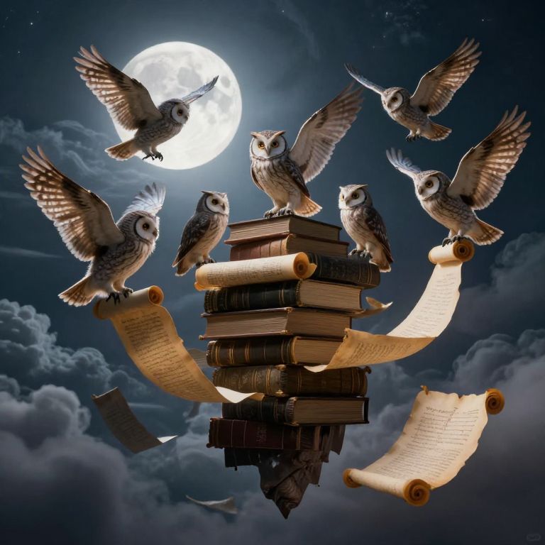 Photograph-like digital illustration of seven owls with white and brown speckled feathers, some perched on a tall stack of old, leather-bound books, with curled, yellowed scrolls unfurling from the stack. The scene is set against a night sky filled with dark, fluffy clouds and a bright full moon, casting a luminous glow. The owls are in various dynamic positions, some flying, others perched, with detailed feathers and expressive eyes. The overall composition evokes a mystical, magical atmosphere, blending elements of nature and ancient knowledge.