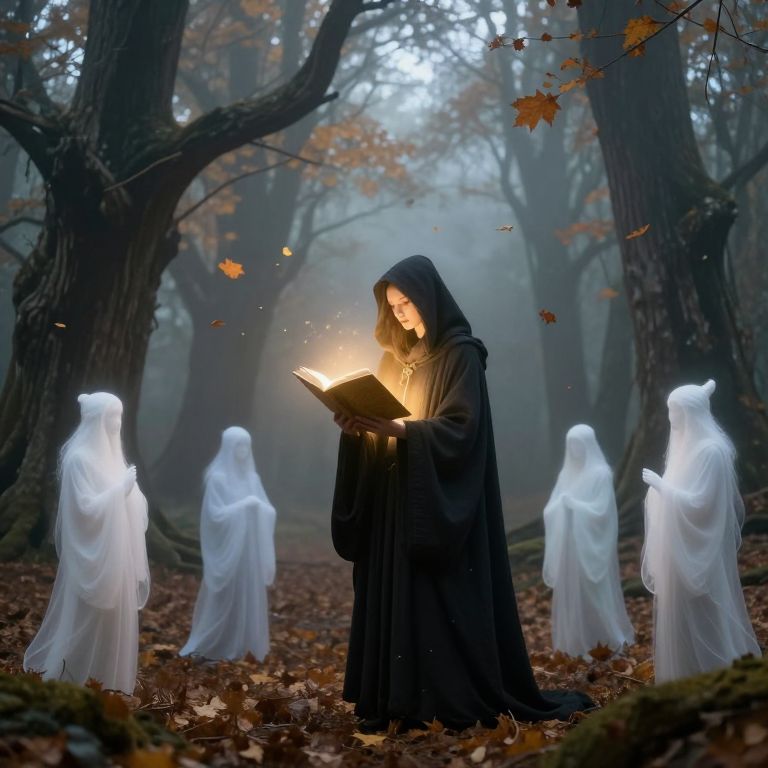 Mystical forest scene: hooded woman in black robe reads glowing book, surrounded by ethereal white ghost-like figures, autumn leaves falling.