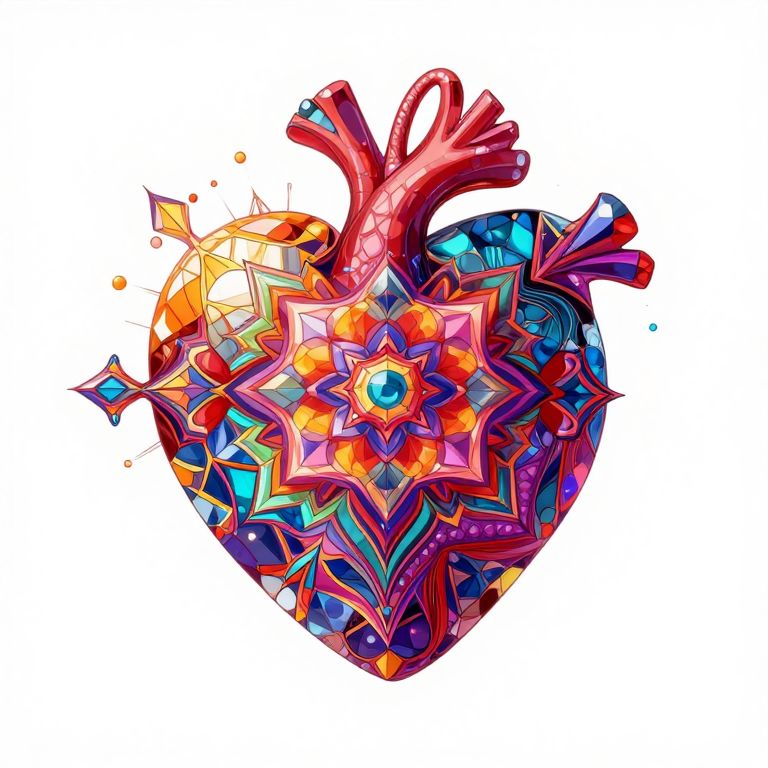 A kaleidoscopic heart mandala bursts forth with radiant colors and intricate patterns, defying the boundaries of reality as it transforms into a living, breathing jewel of the soul.