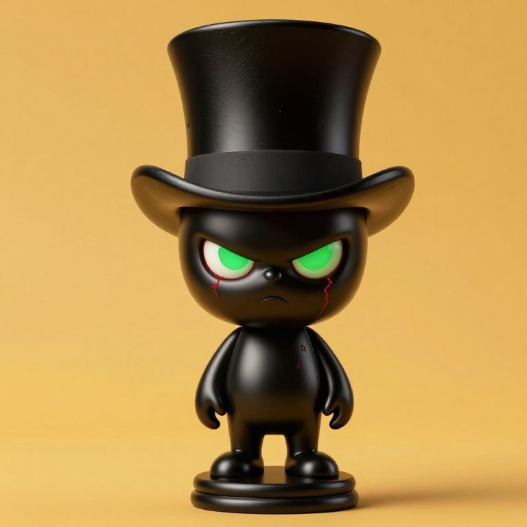 Photograph of a black, chibi-style figurine with angry green eyes, a top hat, and a small bloody tear, standing against a yellow