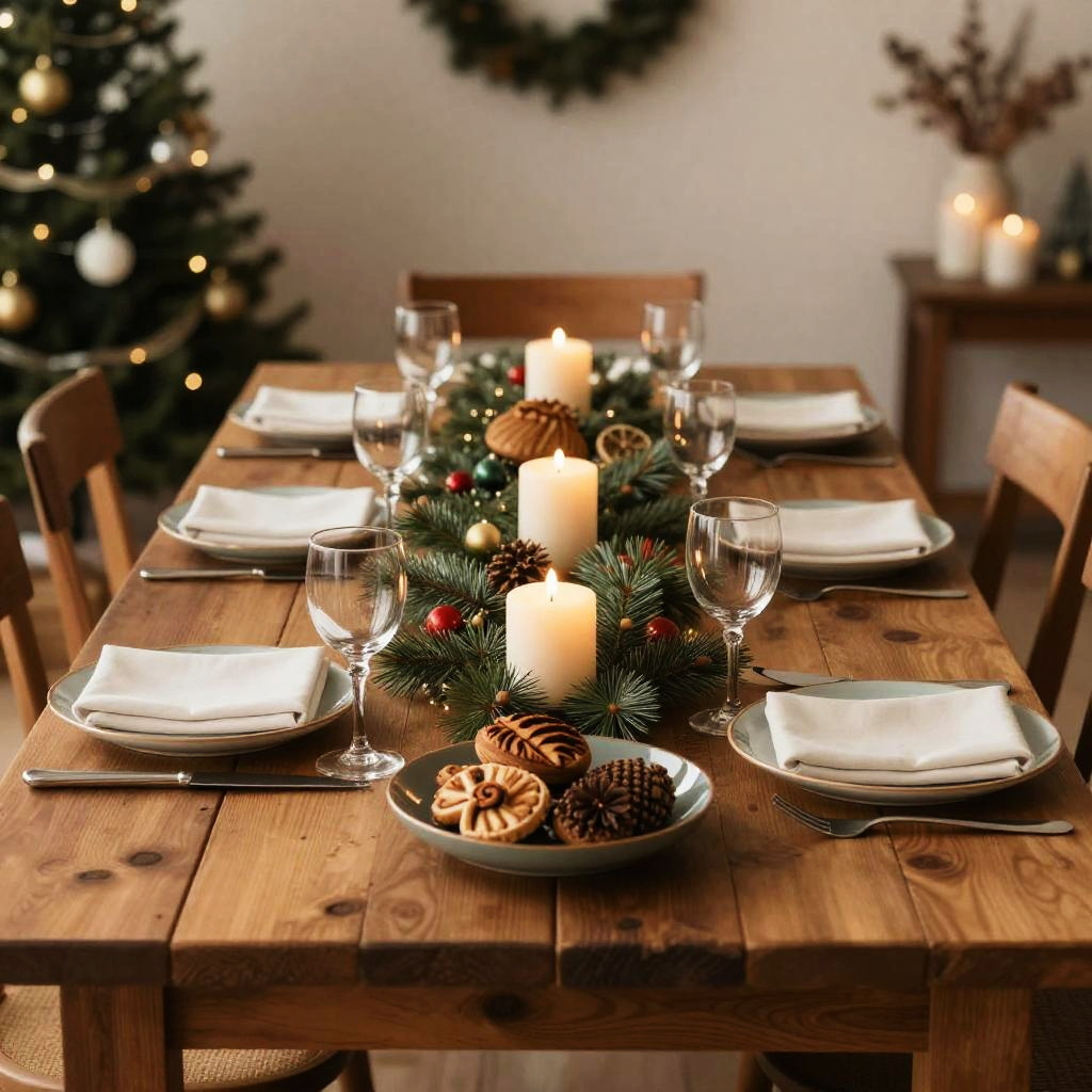 Foto Navidad focusing on a rustic wooden table set for Christmas dinner, elegant dishes, candles, pine garlands, and festive decorations, evoking warmth, tradition, and togetherness in a charming holiday setting.