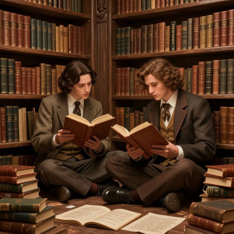 Photograph of two young men with wavy brown hair, sitting cross-legged on a wooden floor in a library filled with tall, dark wooden bookshelves. Both wear dark brown, pinstriped suits with white shirts and black ties. They are intently reading open books, with additional books stacked around them. The background is filled with rows of leather-bound books, adding a scholarly atmosphere. The lighting is warm, highlighting the rich textures of their clothing and the wooden shelves. The image exudes a vintage, intellectual vibe.