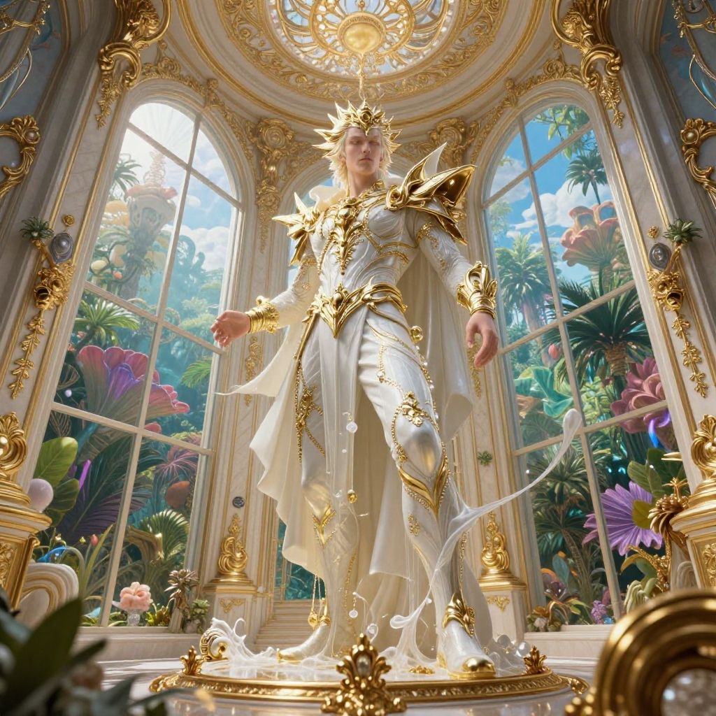 Photograph of a regal, fair-skinned woman with blonde hair, wearing an elaborate, gold-embellished white gown and a sunburst crown. She stands in an ornate, sunlit conservatory with tall, arched windows showcasing vibrant, oversized flowers. The room is adorned with gold accents and intricate moldings. Her right arm is raised, and her left hand rests on her hip. Sunlight streams in, highlighting her ethereal presence. The floor features a glowing, circular pedestal beneath her feet. The image has a surreal, almost CGI-like quality, blending realism with fantasy elements.