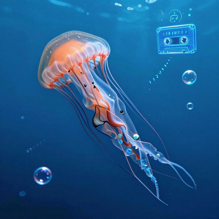 A jellyfish with strands of old cassette tapes for tentacles swims through a digital ocean, playing ambient music in binary bubbles.