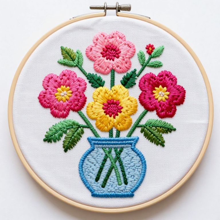 Circular embroidery hoop showcasing a vibrant floral design featuring three blossoms—pink, yellow, and magenta—arranged on green stems with leaves, set within a light blue vase stitched onto white fabric.