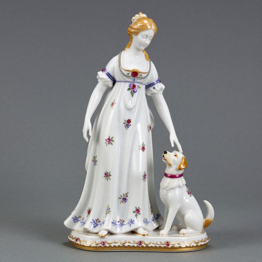 Elegant Imperial Russian porcelain figurine depicts a woman in a flowing white gown adorned with floral patterns, gently petting a small dog seated at her side, both standing on a scalloped base with intricate detailing.