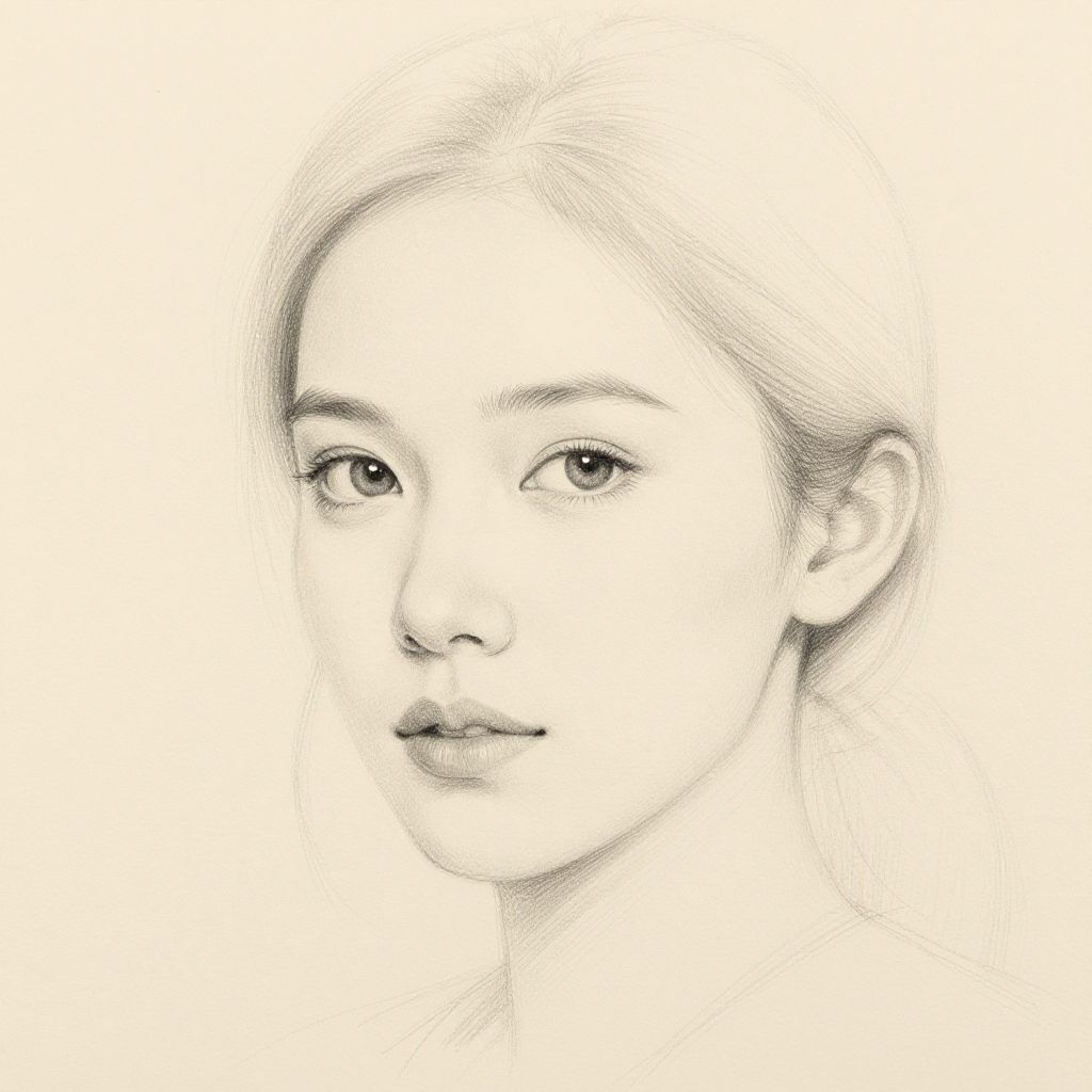 Monochrome pencil sketch of a young woman with soft features, delicate eyes, and subtle smile, head slightly turned to the left.