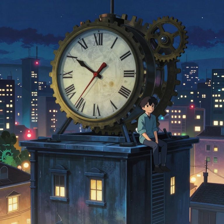 Animated Scene of Boy Sitting by Giant Clock on Rooftop at Night