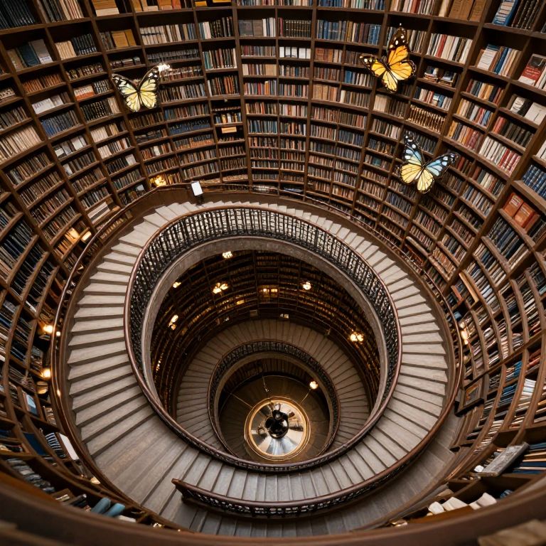 Photograph of a grand, spiral library staircase with wooden steps, bookshelves, and colorful butterflies floating above, creating a mesmerizing, symmetrical