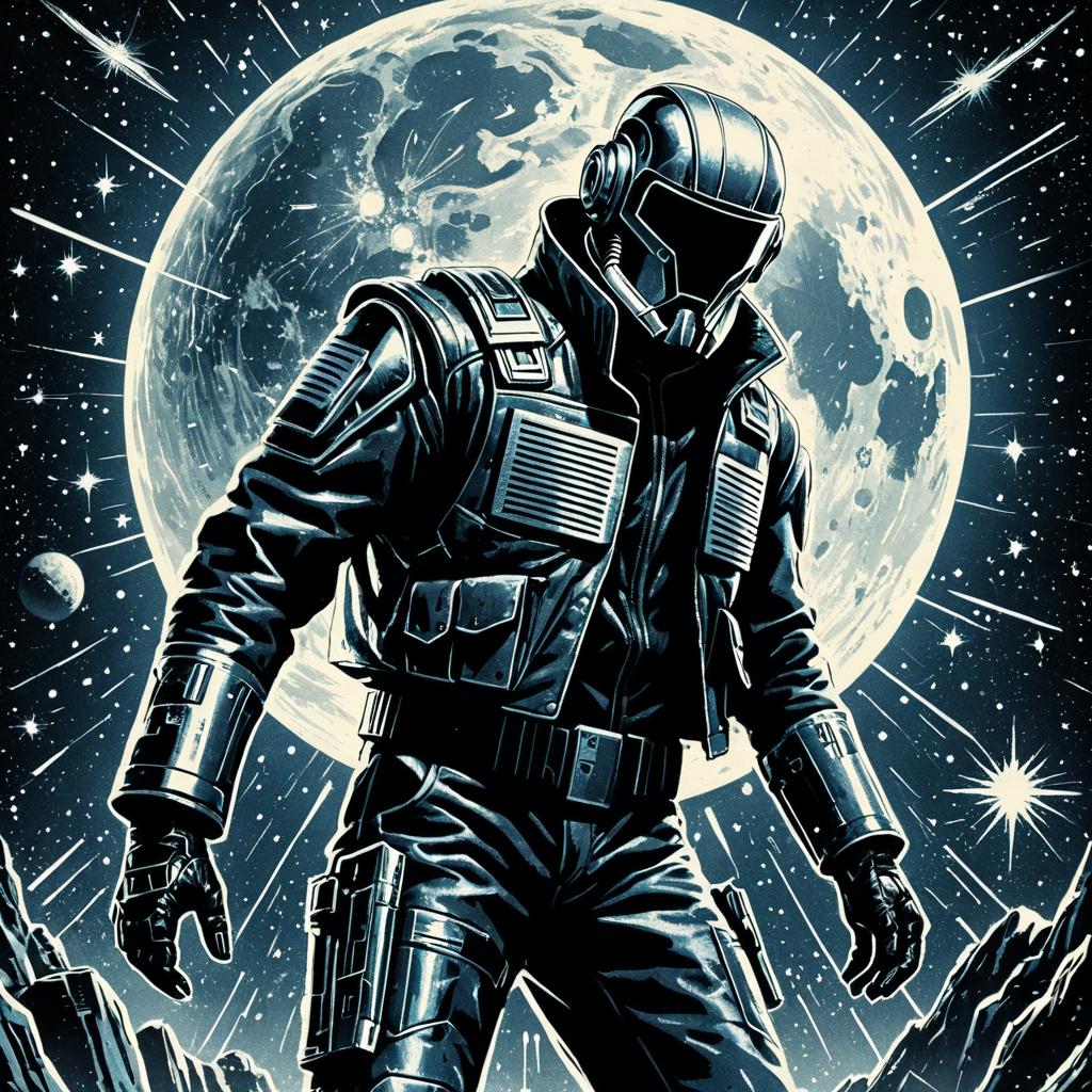 A retro sci-fi poster illustration featuring a cybernetic smuggler in an armored jacket and gloves, set against a large, detailed moon with stars and celestial bodies in the background. The character is depicted in cold metallic shades with a film noir pulp style, emphasizing a futuristic, armored aesthetic.