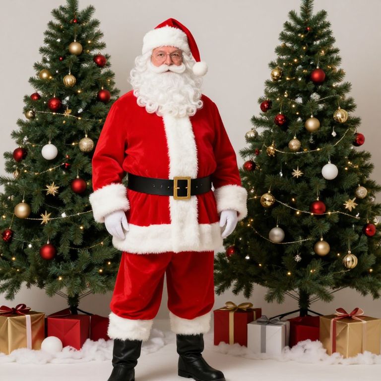 Male santa claus with a red and white outfit and a Santa hat.