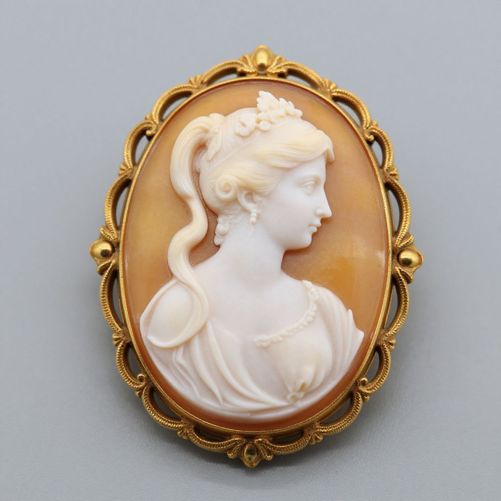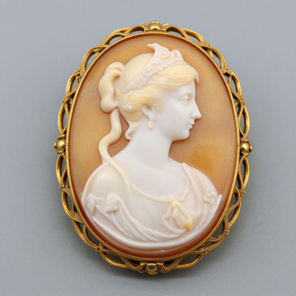 Antique Shell Cameo Pendant Brooch featuring a finely carved profile of a woman in cream against a warm amber background, encased in intricate 10K gold filigree detailing, showcased as vintage jewelry by Yourgreatfinds.