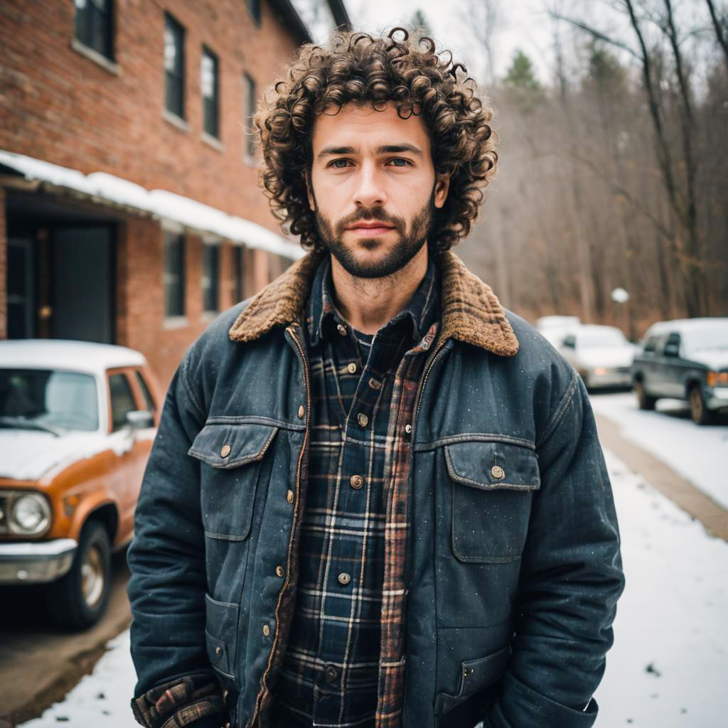 Photo of a Rugged Build man, Curly Hair, winter outfit, vintage bomber jacket and plaid flannel, soft-focus retrospec