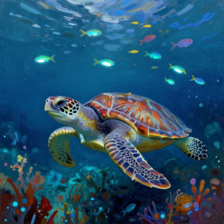A tranquil underwater haven illuminated by bioluminescent flora and fauna, reminiscent of an abstract expressionist painting. In this captivating scene, a regal sea turtle adorned with intricate patterns gracefully glides through the water, accompanied by a school of luminous fish that shimmer like vibrant brushstrokes on canvas. The perspective is from within the turtle's shell, offering a close-up view of the mesmerizing beauty enveloping it. This evocative image conveys a sense of serenity and awe, beckoning viewers to immerse themselves in the untamed wonders of this enchanting aquatic realm.