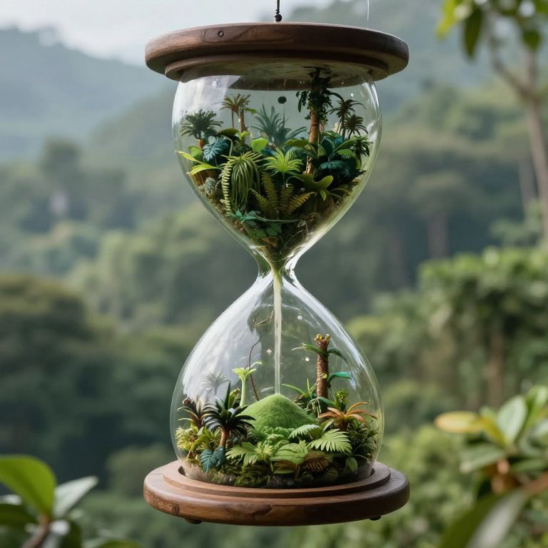 Photograph of a glass hourglass suspended in mid-air, filled with miniature tropical plants, including ferns, small palm trees, and moss. The hourglass has wooden circular bases and is centered against a blurred background of lush, green, mountainous forest. The glass is clear, allowing a detailed view of the tiny flora inside. The natural light highlights the vivid greens and browns of the plants, contrasting with the soft, misty blue and green hues of the forest in the background. The overall composition evokes a sense of timelessness and natural beauty.