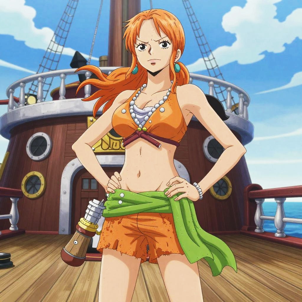 Nami One Piece time skip standing confidently on the Thousand Sunny ship deck, wind blowing through her orange hair, detailed anime style, vibrant colors, dynamic pose