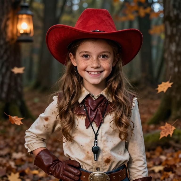 A high-resolution photo of a joyful girl with freckles, large brown eyes, and a warm smile dressed as a cowboy for Halloween, wearing a dusty cowboy outfit with a red cowboy hat, leather gloves, and a belt with a cowboy whistle, standing in a dark forest with lanterns swinging from trees and an autumnal scene with leaves falling around her, realistic skin texture and natural lighting.