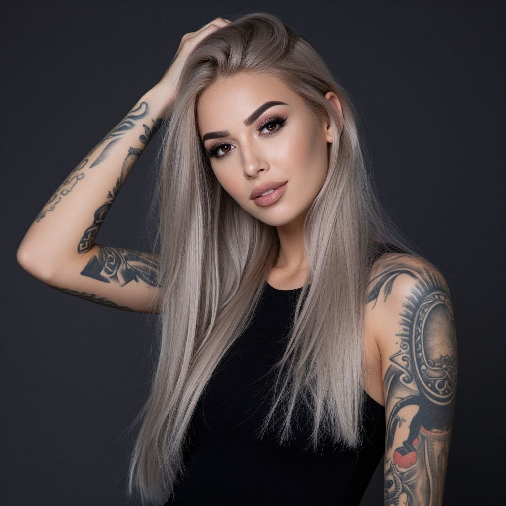 Photograph of a young woman with long, straight, platinum blonde hair and light skin. She has dark, well-defined eyebrows, bold eyeliner, and nude lipstick. She's wearing a black sleeveless top that reveals her extensive tattooed arms. Her left hand is raised to her head, and she's smiling softly. The background is a plain, dark gray. The overall style is edgy and modern.