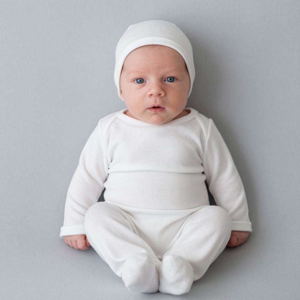 Newborn fashion costume, solo, male focus, 1boy, blue eyes, grey background, looking at viewer, simple background, long sleeves, closed mouth, child