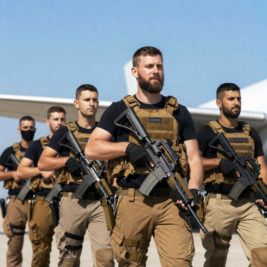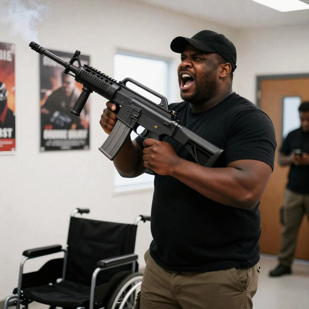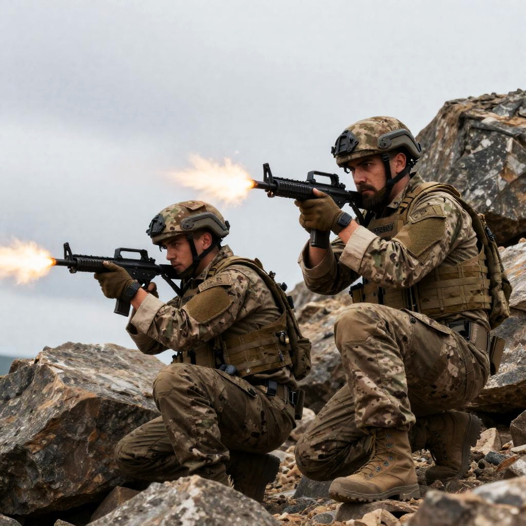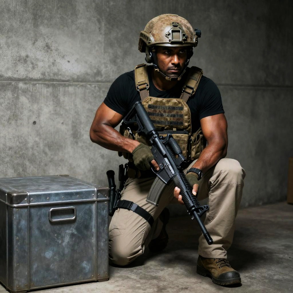 Photograph of two Black male soldiers in a concrete warehouse. One soldier with short black hair, black t-shirt, and camo pants, fires a large rifle, shooting a white smoke stream. The other soldier with short black hair, green shirt, and camo pants, stands behind a truck, holding a rifle. Truck has an open flatbed and orange lights on top. Both soldiers look focused.