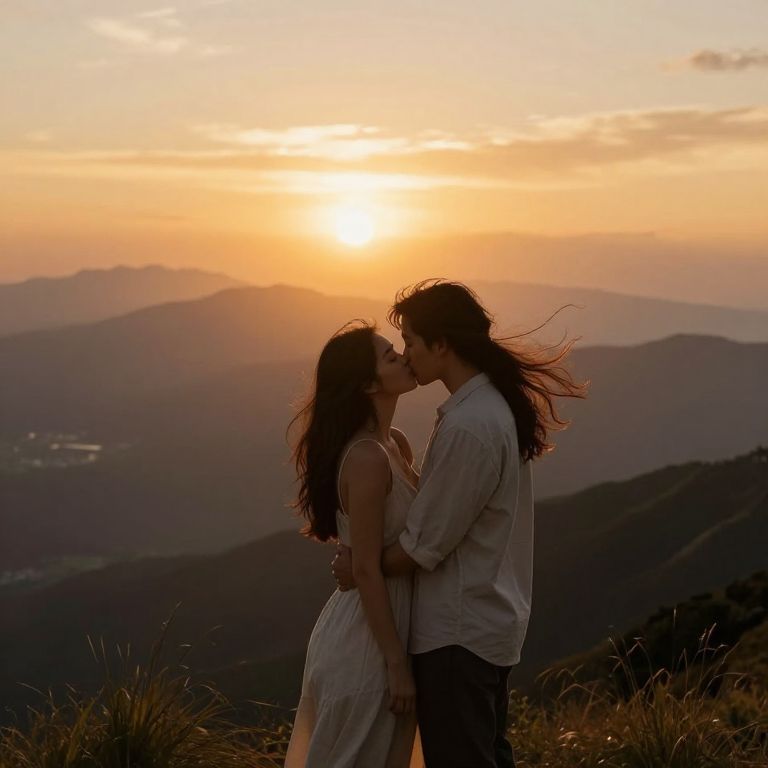 Amidst the golden embrace of a mountain sunset, two souls unite in a tender kiss, their love transcending the vastness of nature, while the whispers of the wind carry the promise of eternity.
