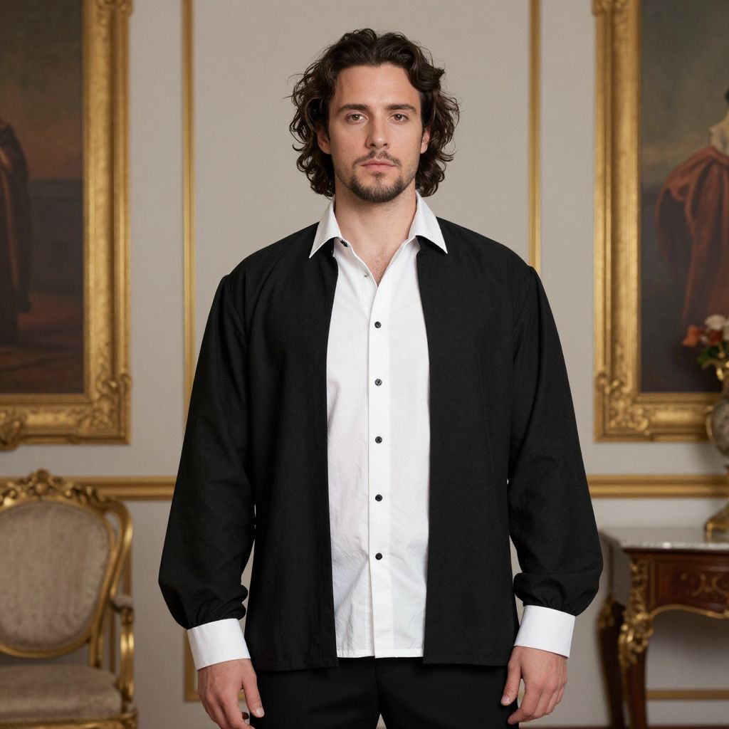 Renaissance Costume Shirt, man in a black and white outfit standing in a room